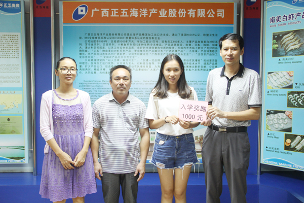 自正五海產(chǎn)公司《職工子女考上大學本科入學獎勵辦法》實施5年來,已經(jīng)對十幾名考上大學本科的員工子女給予了獎勵。2017年獲得此項獎勵的員工子女是生產(chǎn)部員工符廣文的女兒符贊萍,她以優(yōu)異的成績考上廣西科技大學。
